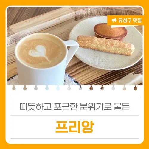추운 겨울 따뜻한 감성으로 마음까지 녹여버린 카페 프리앙 을 소개해 드리려 합니다. 사장님께서 정말 친절하시고, 예쁜 미소로 응대해주셔서 더욱 더 기분이 좋았습니다. 유성구청 바로 옆에 있어서 점심시간에 잠깐 나와서 커피 마셔도 좋은 곳입니다.