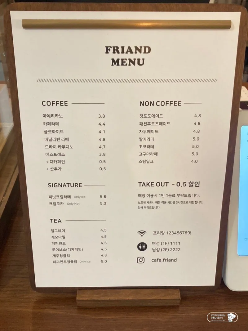 아메리카노, 카페라떼, 플랫화이트 같은 커피류도 있고 얼그레이티, 캐모마일티, 페퍼민트티, 청포도 에이드, 딸기라떼, 초코라떼 등등 음료도 다양하게 있습니다. 와이파이와 화장실 비밀번호도 적혀있어 따로 묻지 않아도 바로 알 수 있었습니다.