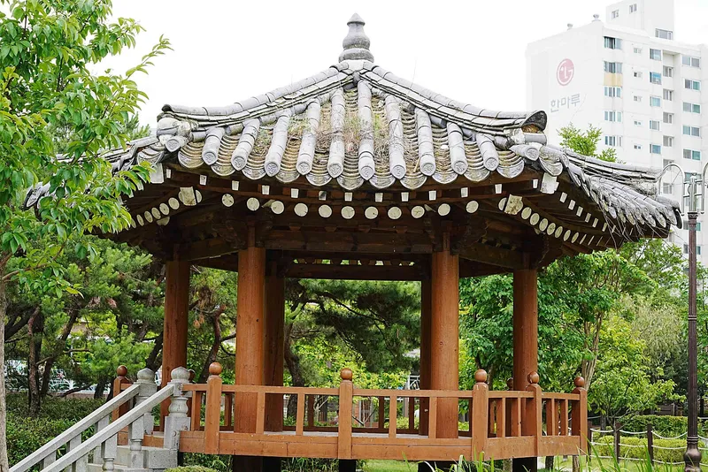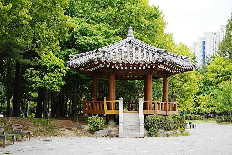 입구가 총 세 개가 있습니다. 그중 아파트 단지 쪽에서 많이 진입하는 부분으로 들어서면 정자가 하나 있습니다.