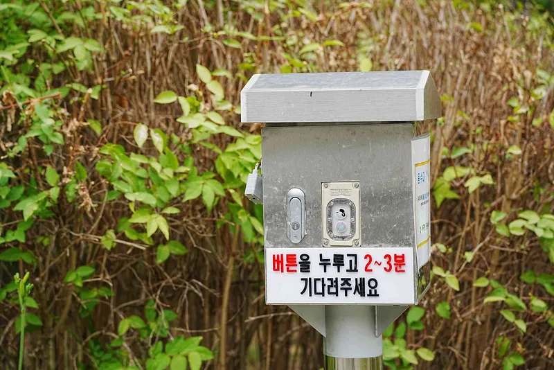 샘물 옆에 버튼을 누르고 2~3분 기다리면 물이 나온다고 표시되어 있습니다. 초등학생으로 보이는 아이들 세명이 와서 물총놀이를 합니다.