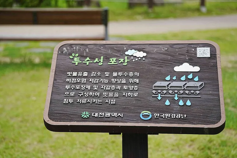 운동 기구들 옆으로 작은 안내판이 하나 있네요. '투수성 포장'이라고 빗물유출 감소 및 물 투수층의 비점오염 저감기능 향상을 위해 투수포장체 및 자갈층과 토양층으로 구성하여 빗물을 지하로 침투 저류시키는 시설이라고 합니다.