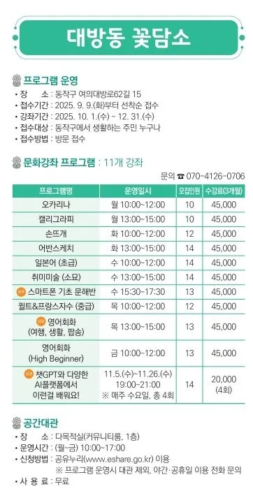 대방동 꽃담소에서도 2025년 4기 프로그램 수강생을 모집합니다!