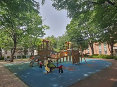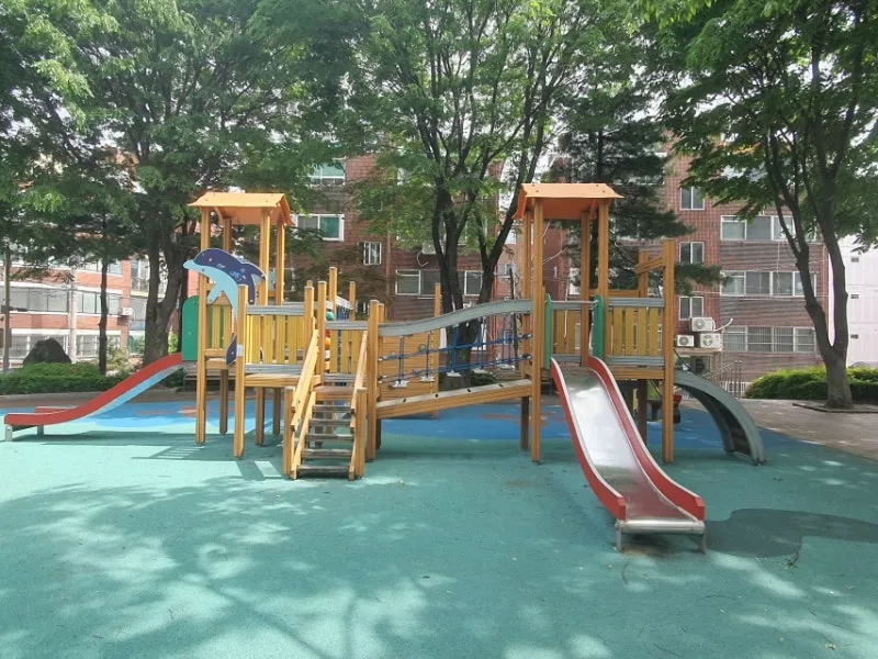 사각형 형태의 아담한 공원은 효율적으로 구성되어 있으면서도 아늑한 분위기를 자아냅니다. 무엇보다 밝고 안전한 탄성 바닥 위에 설치된 어린이 놀이시설 덕분에 아이들이 마음껏 뛰어놀 수 있는 환경이 마련되어 있습니다. 안전성을 고려한 바닥 재질은 보호자들에게도 안심을 더해줍니다.
