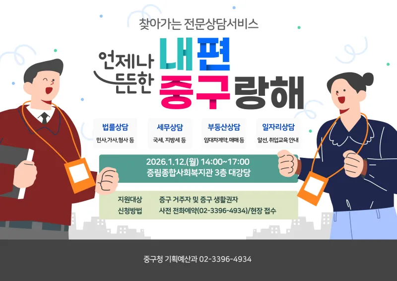 찾아가는 전문상담서비스 <내편중구랑해>로 법률·세무·부동산·일자리 상담받아요!(+1월 운영 안내)