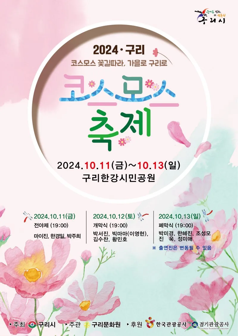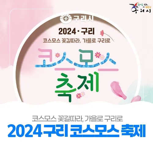 가. 축 제 명 : 2024 구리 코스모스 축제 나. 개최기간 : 2024.10.11.(금)~10.13.(일) - 전야제 : 2024.10.11.(금) 19:00 🚁드론쇼 - 개막식 : 2024.10.12.(토) 19:00 - 폐막식 : 2024.10.13.(일) 19:00 ✨불꽃쇼 다. 주최/주관 : 구리시/(사)구리문화원 |