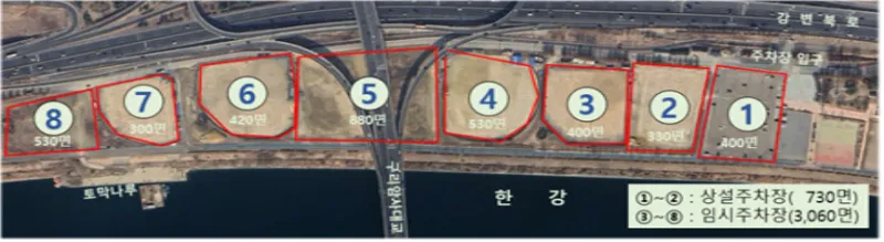 (①~②상시 730면, ③~⑧임시 3,060면)
