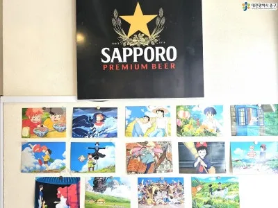 한쪽 벽에는 일본 그림엽서들이 부착되어 있으며