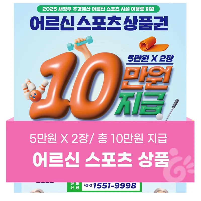 ○ 지원대상 : 기초연금법에 근거한 만 65세 이상 어르신 - 스포츠강좌 이용권, 장애인스포츠강좌이용권 수혜자 중복 지원 불가 ○ 2차 신청기간 : 2025. 9. 5. ~ 예산 소진시까지 * 1차 신청자도 2차 희망 시 신청 필수 ○ 지원금액 : 5만원(1회당 5만원, 2회 총 10만원 지급) ○ 사업기간 : 25년 7월 ~ 12월 ○ 신청방법 - 전화신청(어르신 스포츠 상품권 콜센터 : ☏ 1551-9998) - 온라인 신청(어르신 스포츠 상품권 누리집 : ssvoucher.co.kr) |