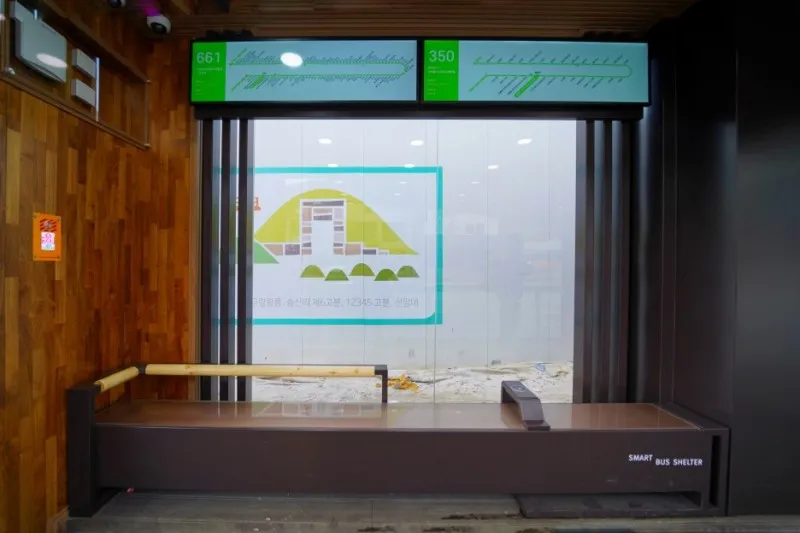 그 밖에 스마트 버스 셸터에는 스마트 냉·난방기, 스마트 무선 충전기(기기에 따라 충전되지 않는 경우도 있다), 공기 청정기, 미세먼지 측정기, 스마트 시정 홍보판 등이 설치돼 있습니다. 스마트 버스 셸터는 단순한 버스 승·하차장의 개념을 훌쩍 뛰어넘는 시설들이 갖춰져 있어 시민의 안전을 지켜주고, 삶의 질을 높여 주는 공간으로 거듭난 듯합니다.