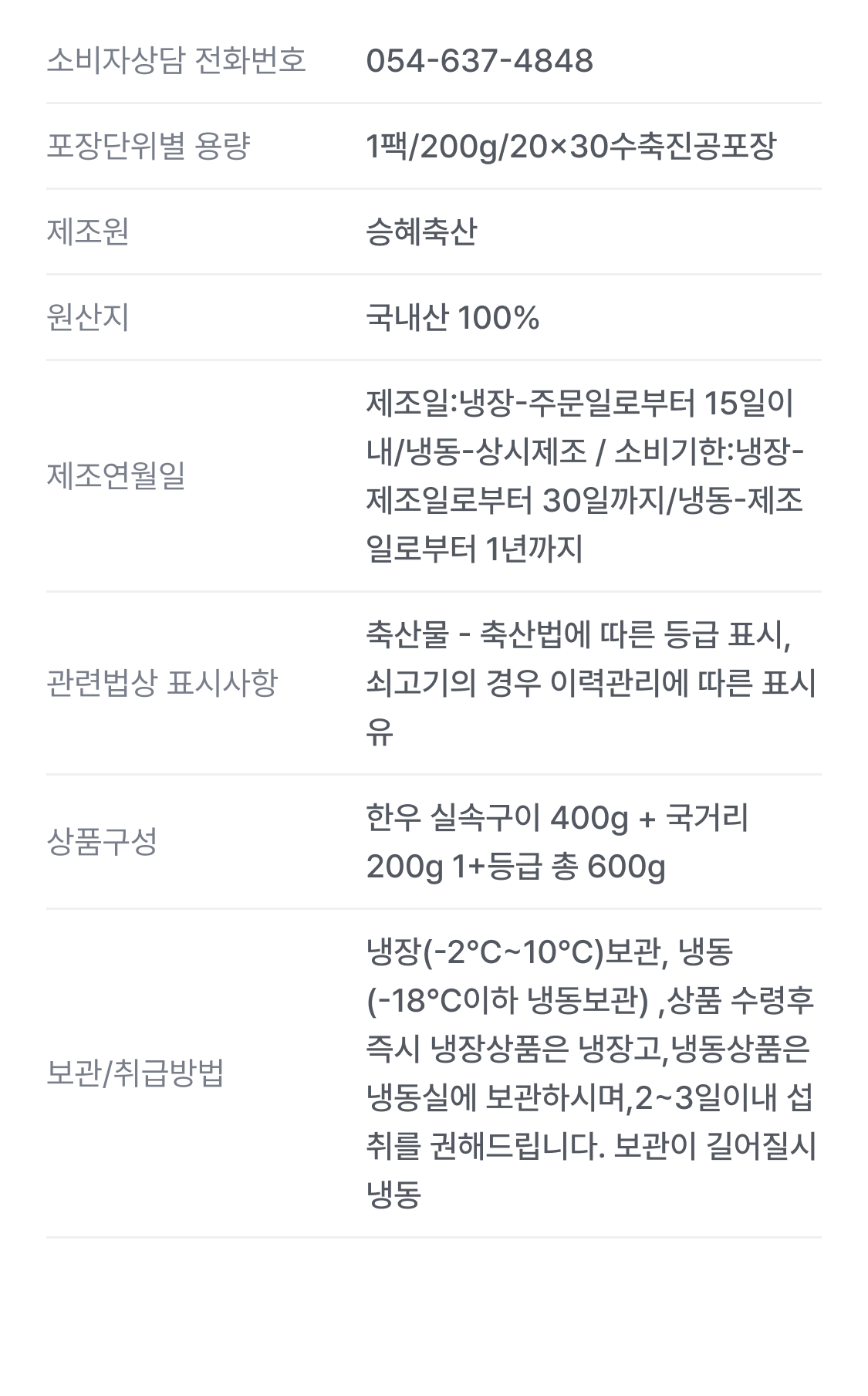한우는 공기 접촉이 차단되면 표면이 갈색 또는 어두운 색으로 변하는 '갈변 현상'이 나타날 수 있습니다. 이는 육류 내 ‘미오글로빈’이라는 성분이 산소와의 접촉이 줄어들며 발생하는 자연스러운 반응으로, 제품의 신선도나 안전성과는 무관합니다.개봉 후 산소와 다시 만나면 원래의 선홍빛을 되찾으니 안심하고 드셔도 좋습니다.
