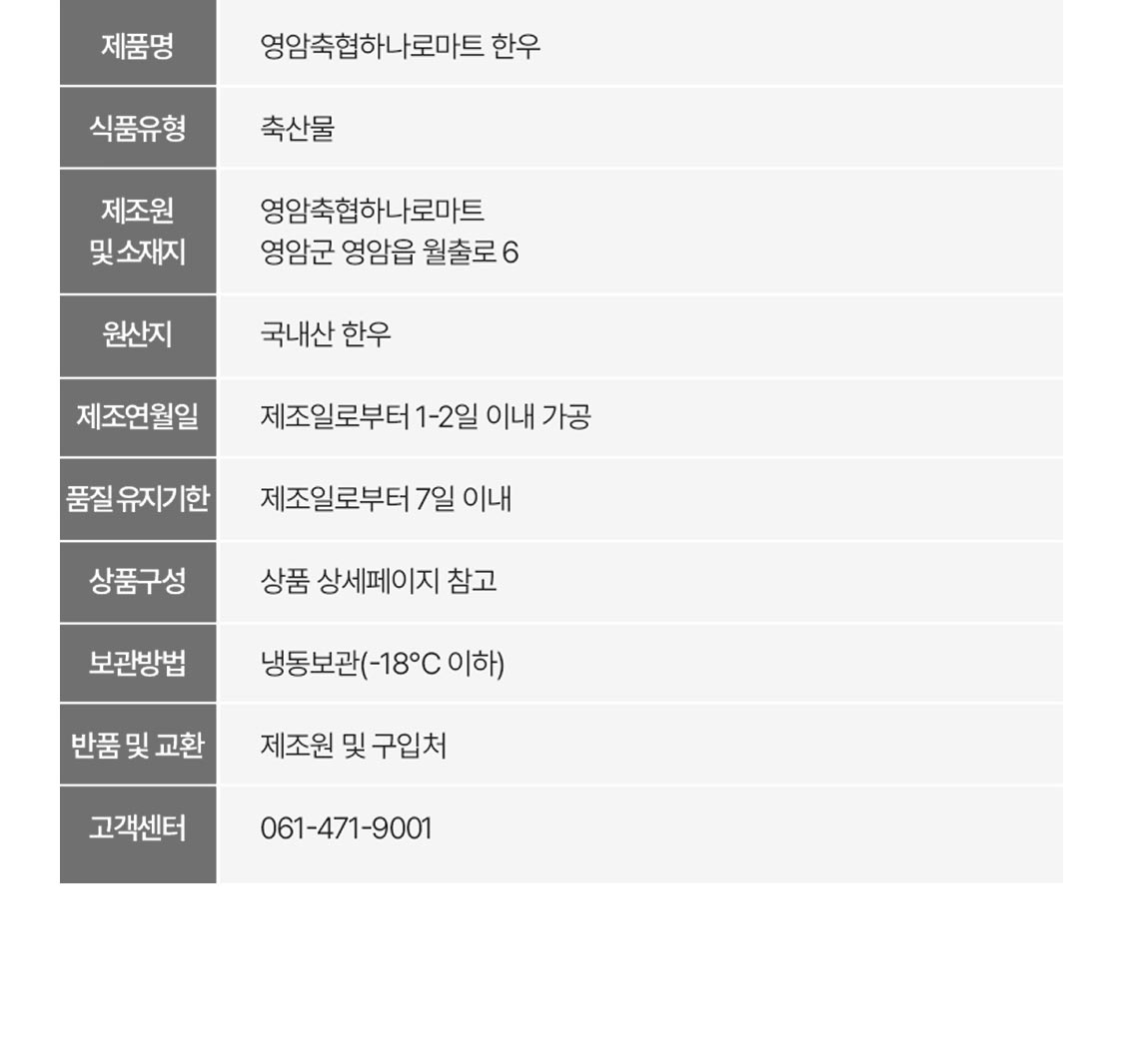 영암축협하나로마트의 모든 한우는 이력(묶음)번호가 라벨에 부착되어있어 한우의 이력을 상세하게 확인하실 수 있습니다.