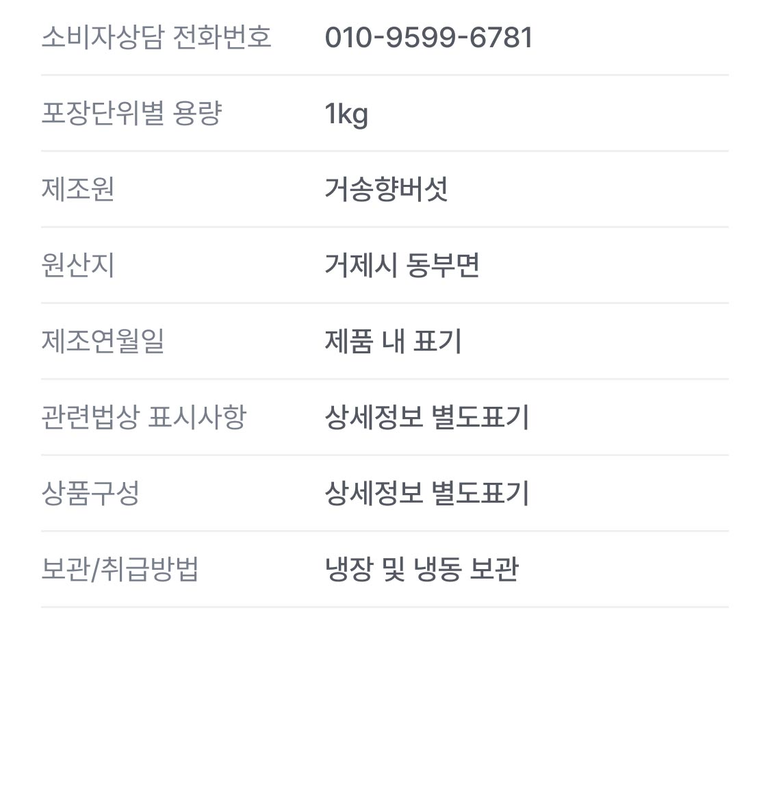 상품 고시 정보 | 상품명 | 거송향버섯 1kg | |:---|:---| | 원산지 | 거제시 동부면 | | 제품 무게 | 1kg | | 식품유형 | 표고버섯 | | 판매원 | 거송향버섯 |