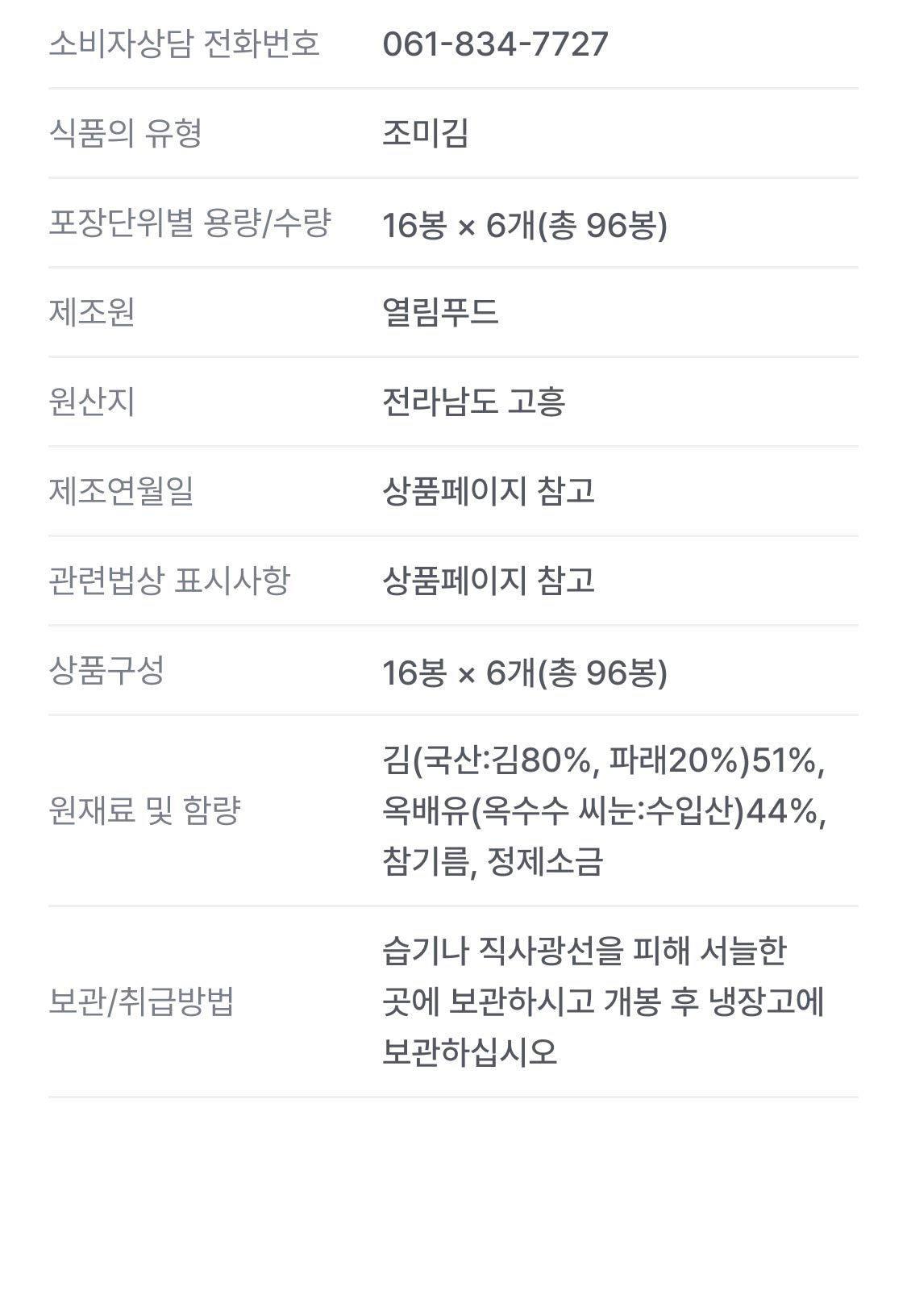 향긋하고 고소한 파래김 96봉 (16봉 × 6개)