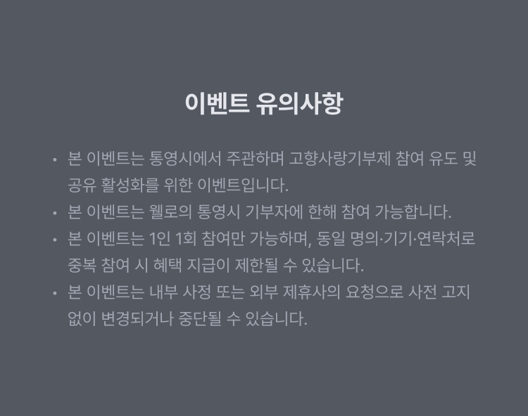 [EVENT] 통영 명품 한돈 선물세트 (삼겹 500g+목심 500g) + 부위별 100g 추가 증정100,000원기부시 증정(99)[EVENT] 해통령 시그니처 육수세트 25개입 × 3봉 + 육수명장 사골맛 1팩 추가 증정100,000원기부시 증정(5)[EVENT] 통영꿀빵 꿀봉이 10구 (2세트) + 6구 (1세트) + 꿀빵 3구 추가 증정100,000원기부시 증정(6)[EVENT] 프리미엄 통영청정어묵 세트 (3봉) + 어묵 분말 스프 1봉 추가 증정100,000원기부시 증정(4)[EVENT] 인후단(도라지환) 40개 + 인후단 5개 추가 증정100,000원기부시 증정(4)[EVENT] 멸치오란다 16개입 + 4개 추가 증정100,000원기부시 증정[EVENT] 시금치 국수 밀키트(국수 2팩+육수 2박스) + 국수 1팩 추가 증정100,000원기부시 증정[EVENT] 통영 젓갈 3종 세트 (단품 3종 세트 / 미니젓갈 3종 세트) + 미니젓갈 150g 랜덤 1개 추가 증정100,000원기부시 증정(9)[EVENT] 리네 비누선물세트(비누 4구+미니 비누 2구+천연 비누받침대 증정) + 미니비누 1개 추가 증정100,000원기부시 증정